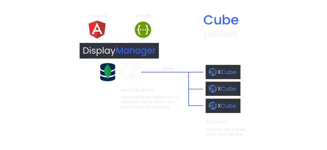 Incorporates a highly intuitive web user interface for video wall management, remote display control, and platform administration, including the monitoring of XCube devices.